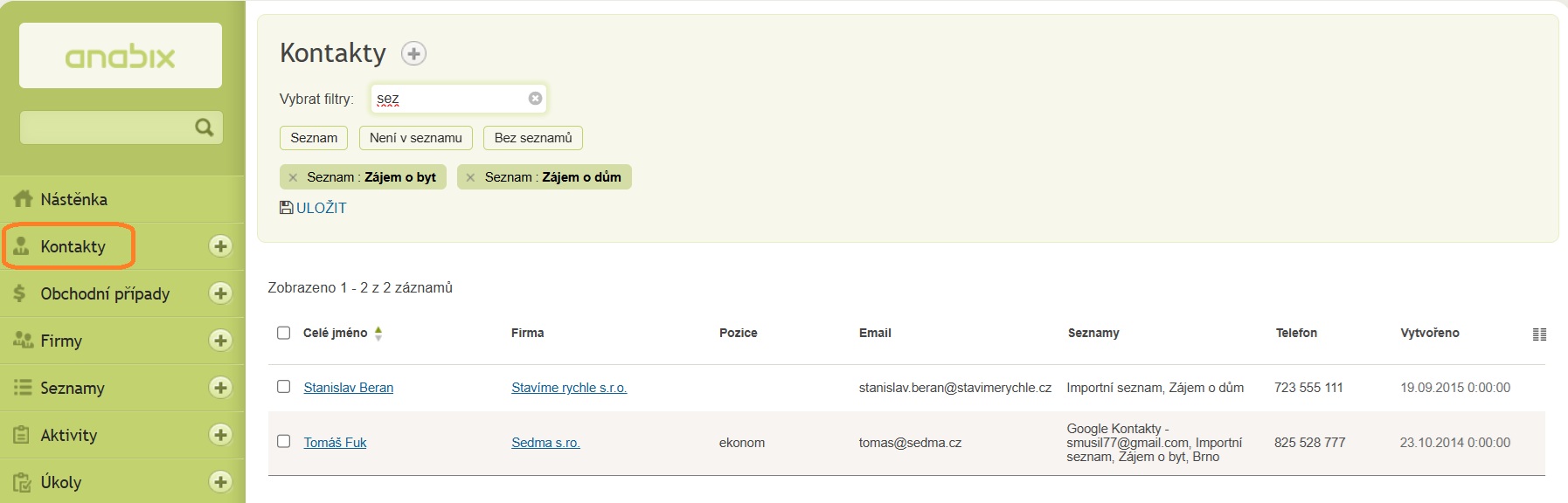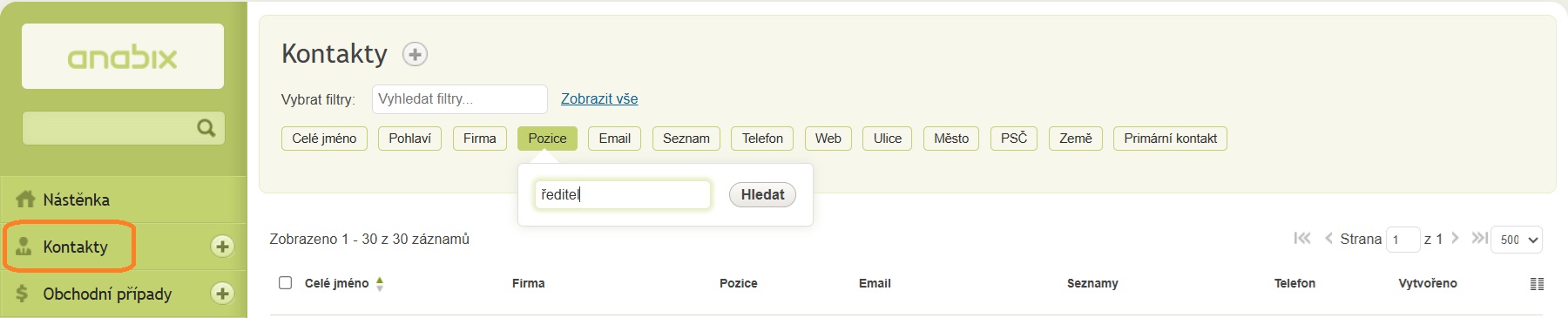 Přehled kontakty v Anabix CRM