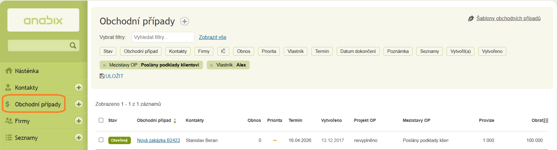 Přehled Obchodní případy v Anabix CRM